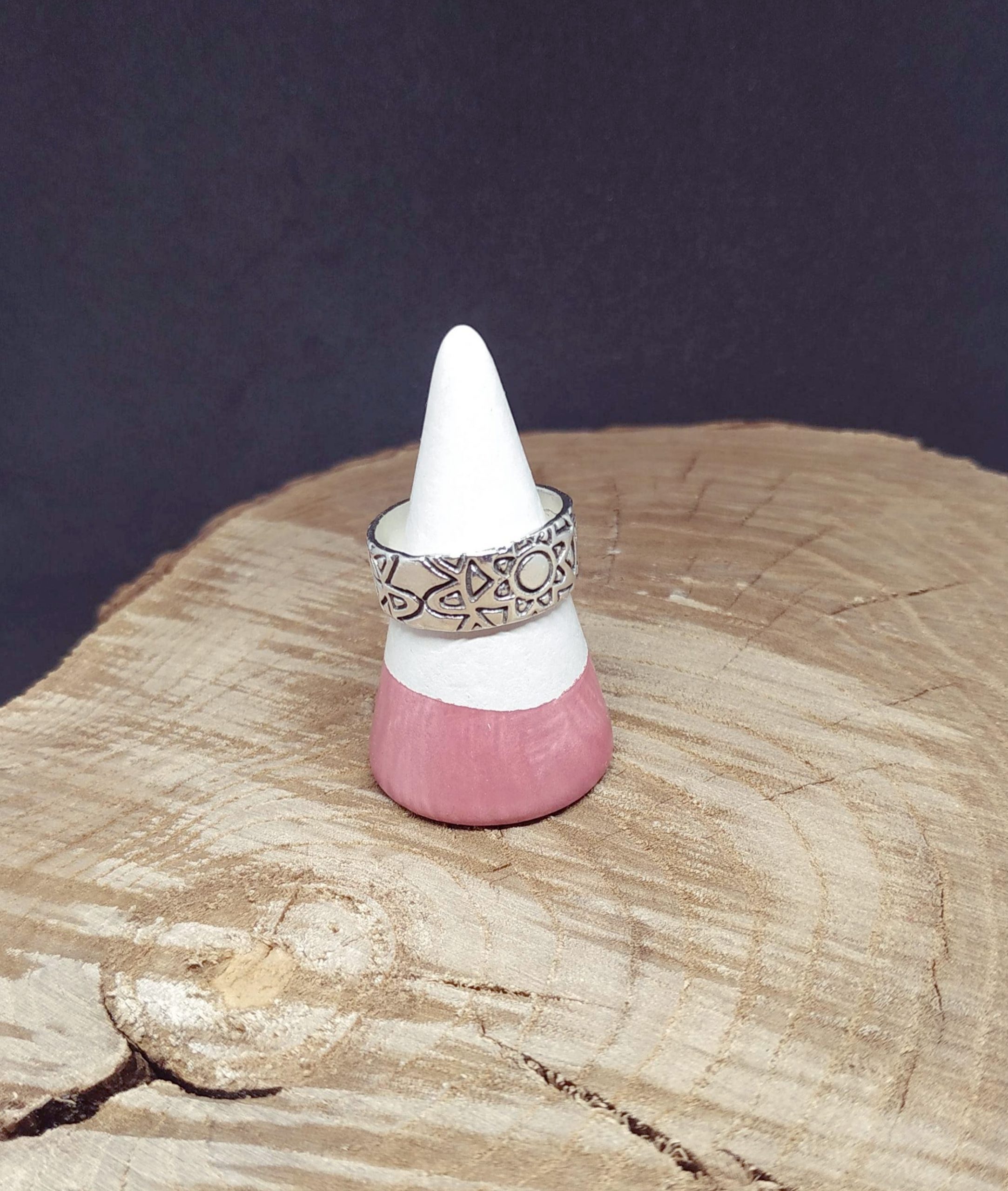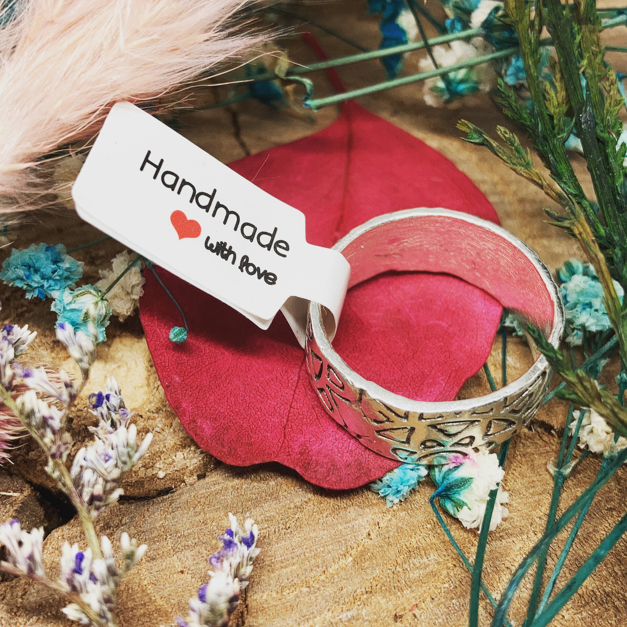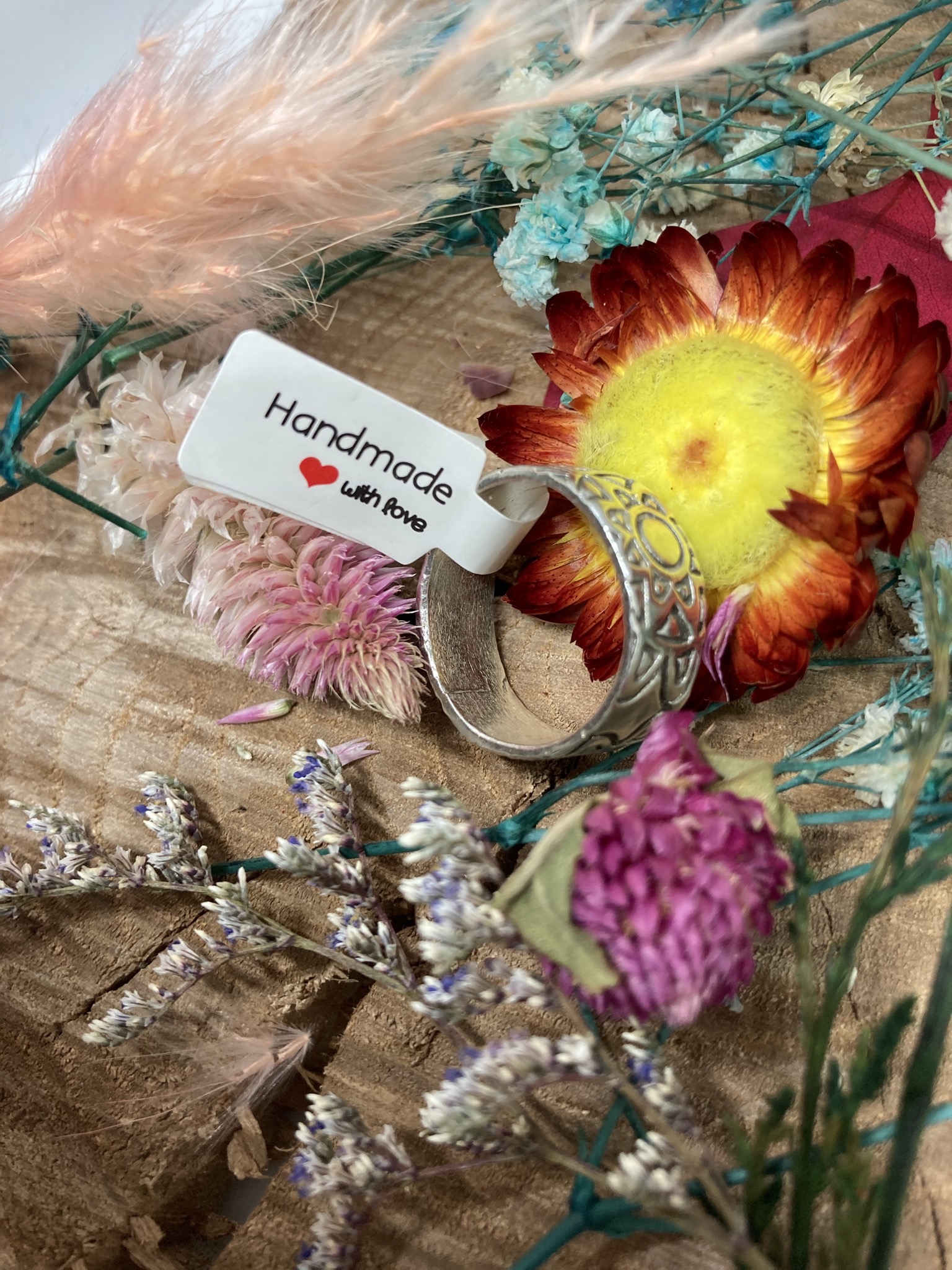 Anillo de plata con grabados de flores envejecidos hecho con la tecnica de la microfusión.