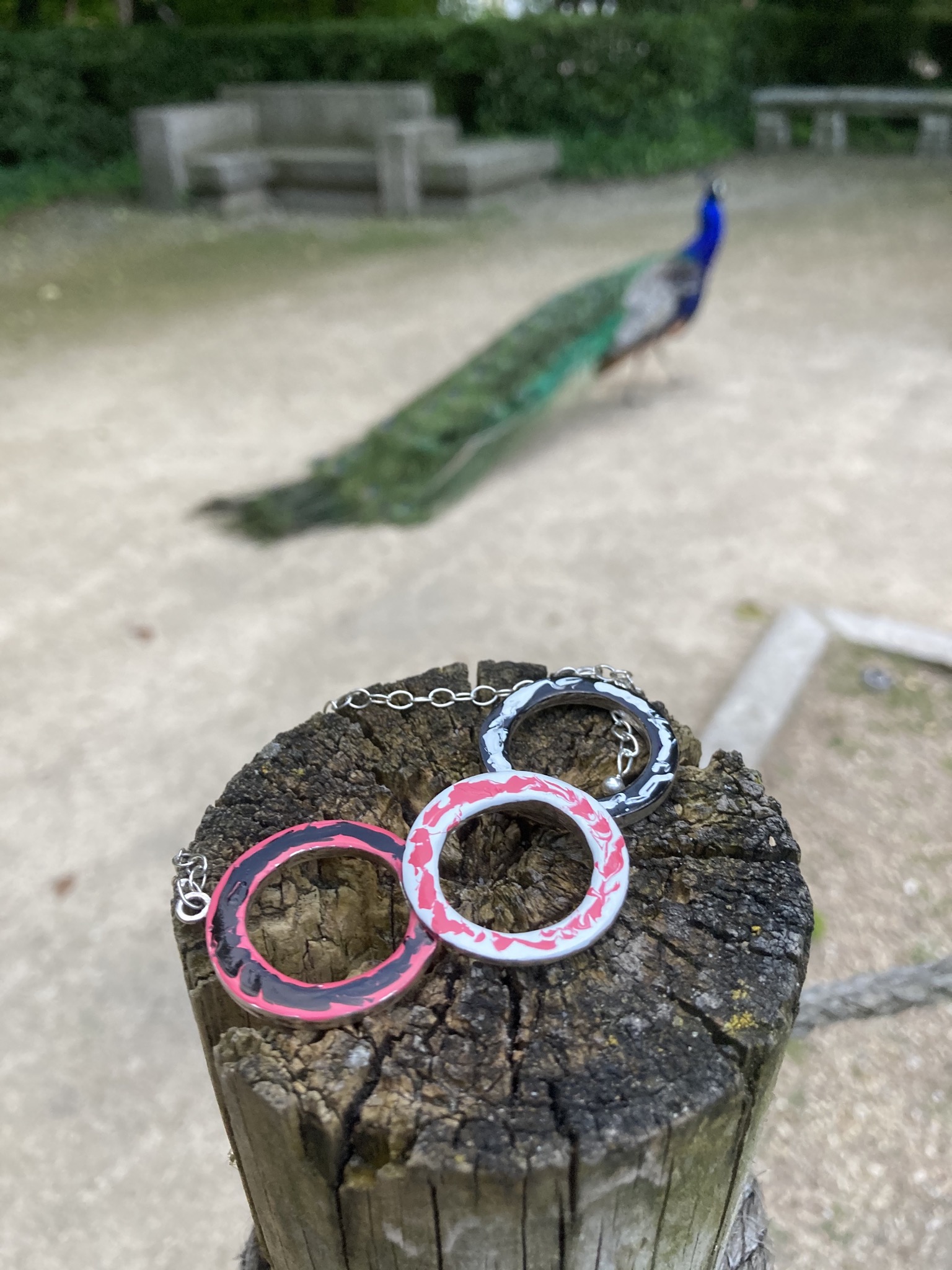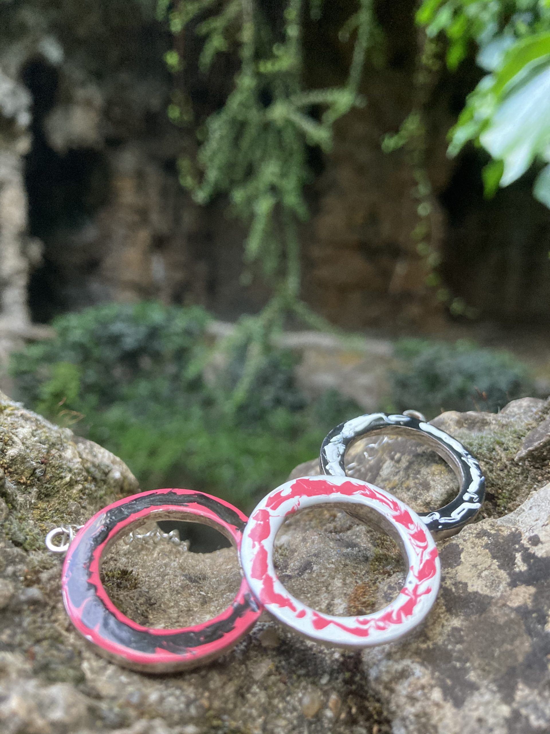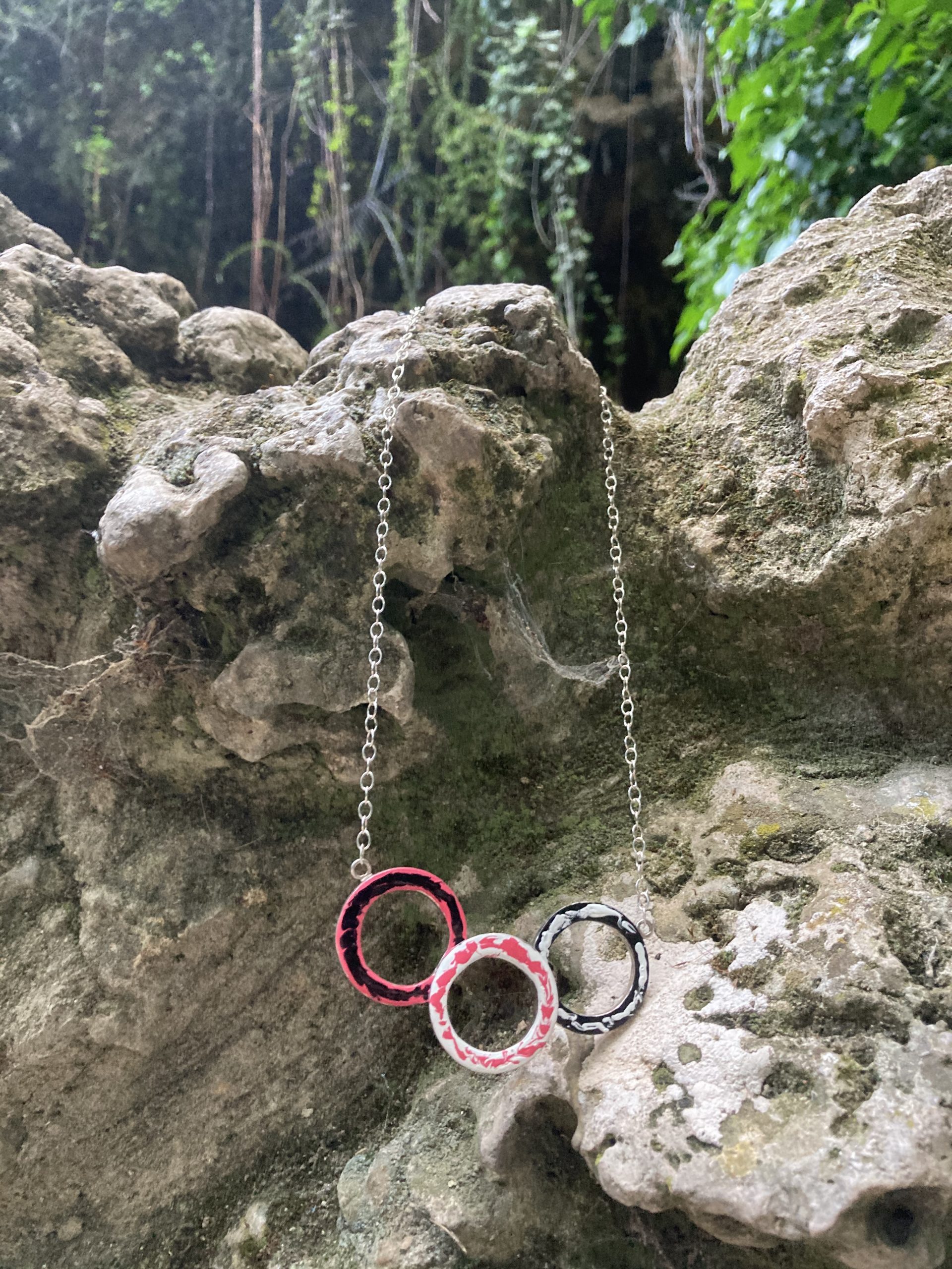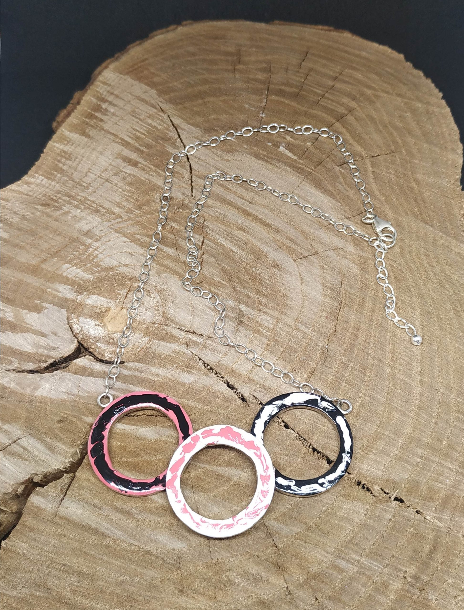 Anillas enlazadas con cadena de plata de 925 milesimas, colgante en esmalte al frio con colores como el rosa, negro y blanco