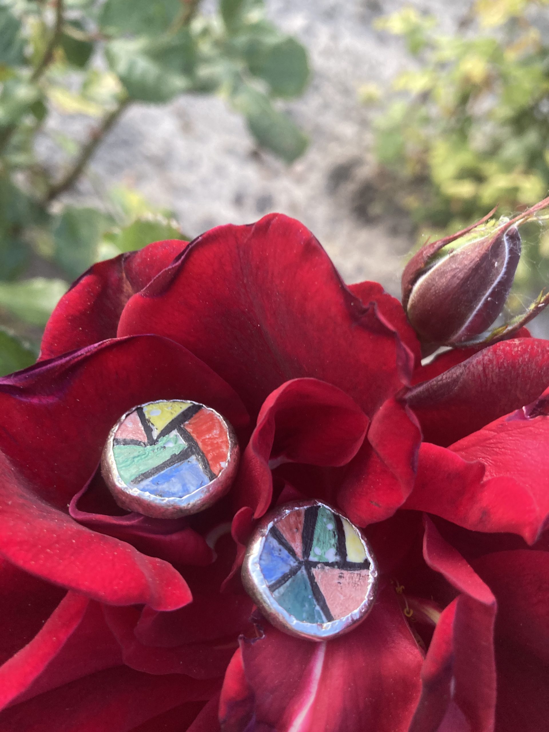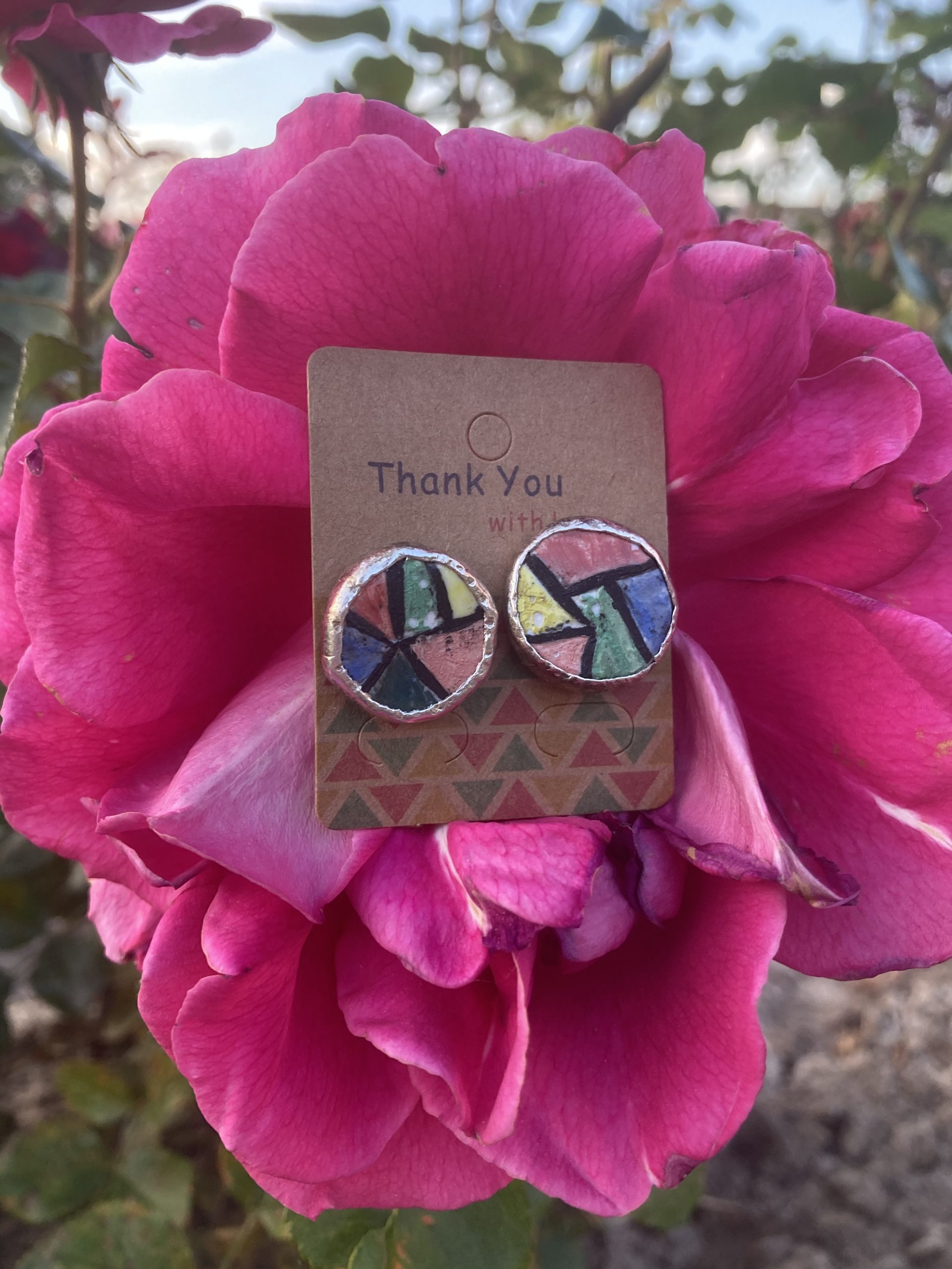 Pendientes de porcelana con esmalte de porcelana engastados de plata de primera ley con palillo y presión tambien de plata de primera ley.