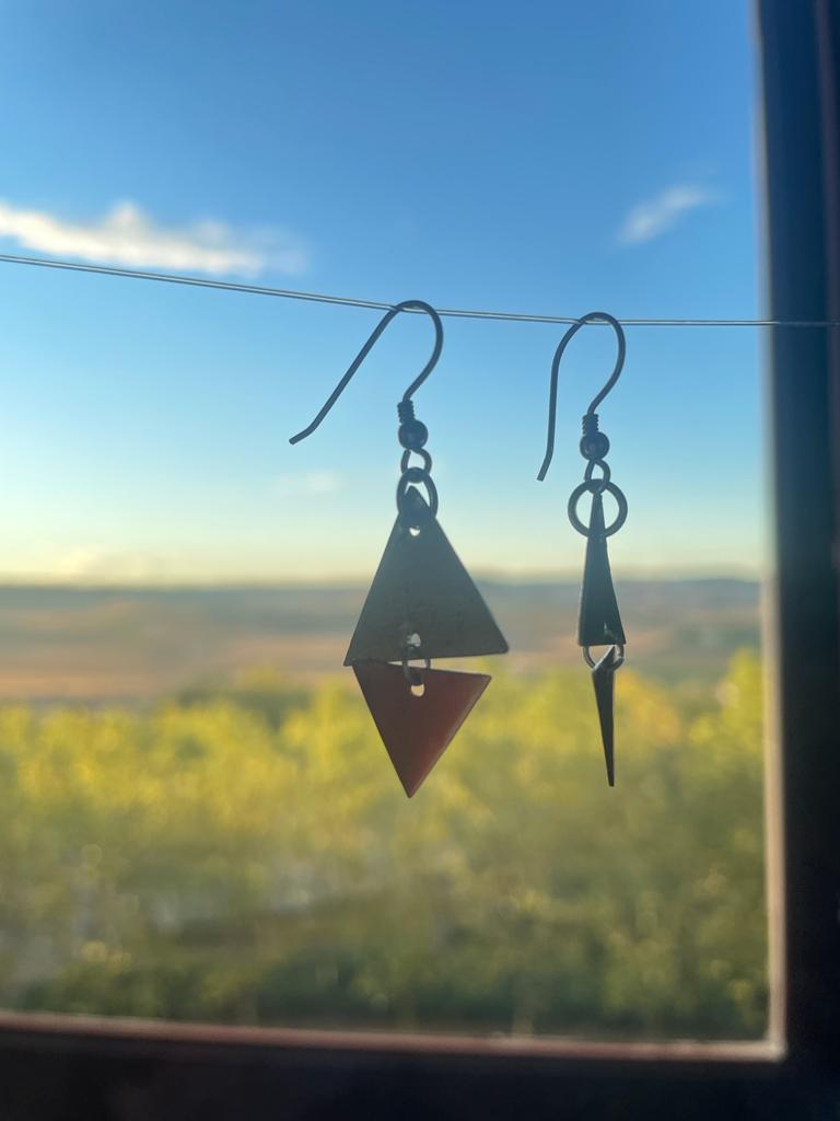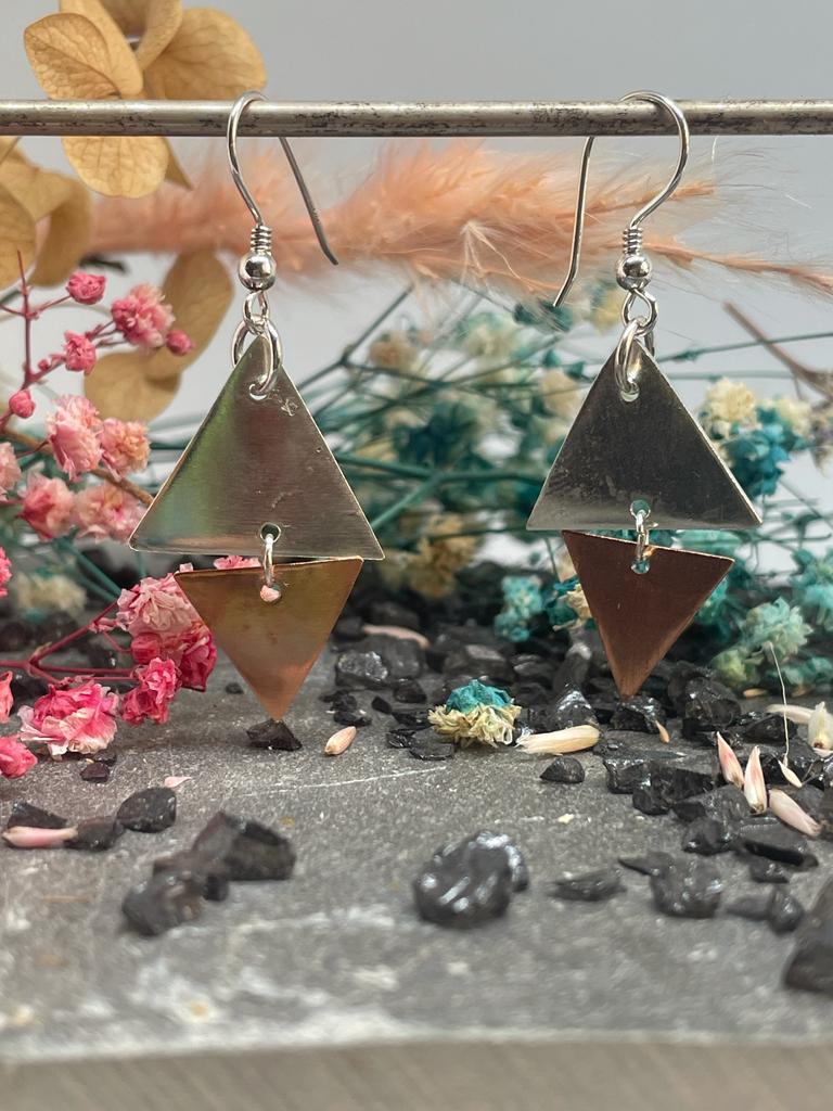 Pendientes de plata y cobre cortada en triangulos y montada y con un juego que hace que el pendiente baile de forma especil.