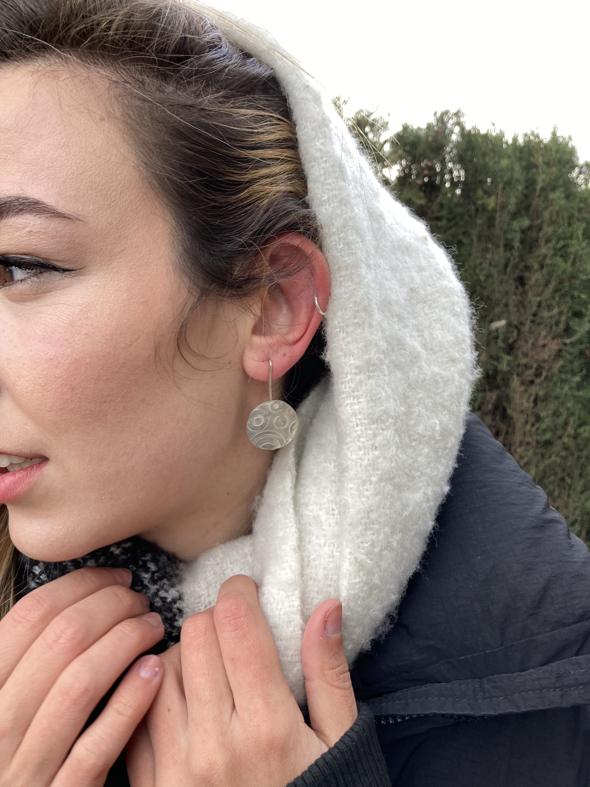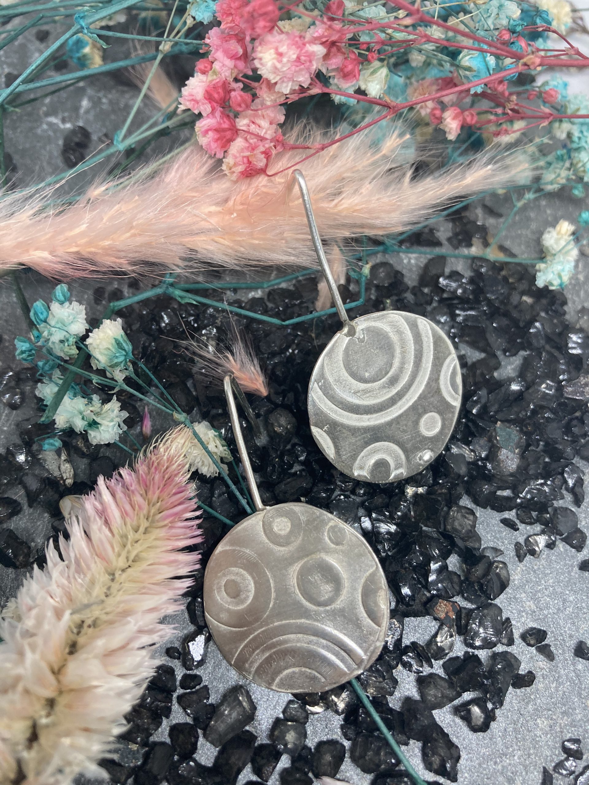 Pendientes largos texturizados con motivos circulares hechos con la tecnica de la microfusión.
